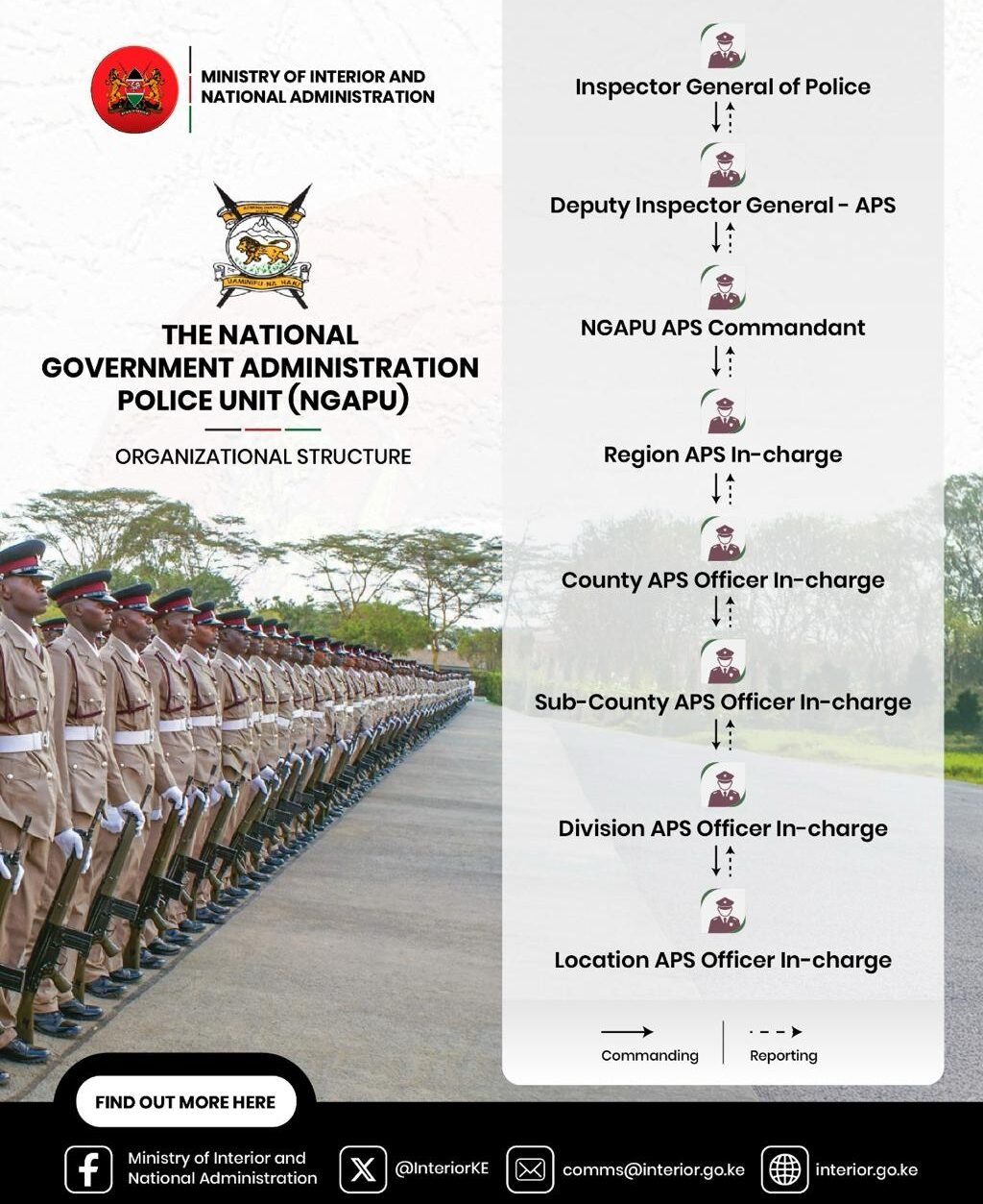 At the grassroots level, Sub-County Commanders and Station Commanders manage daily operations, coordinate with local administrative officers, and ensure seamless service delivery to communities.