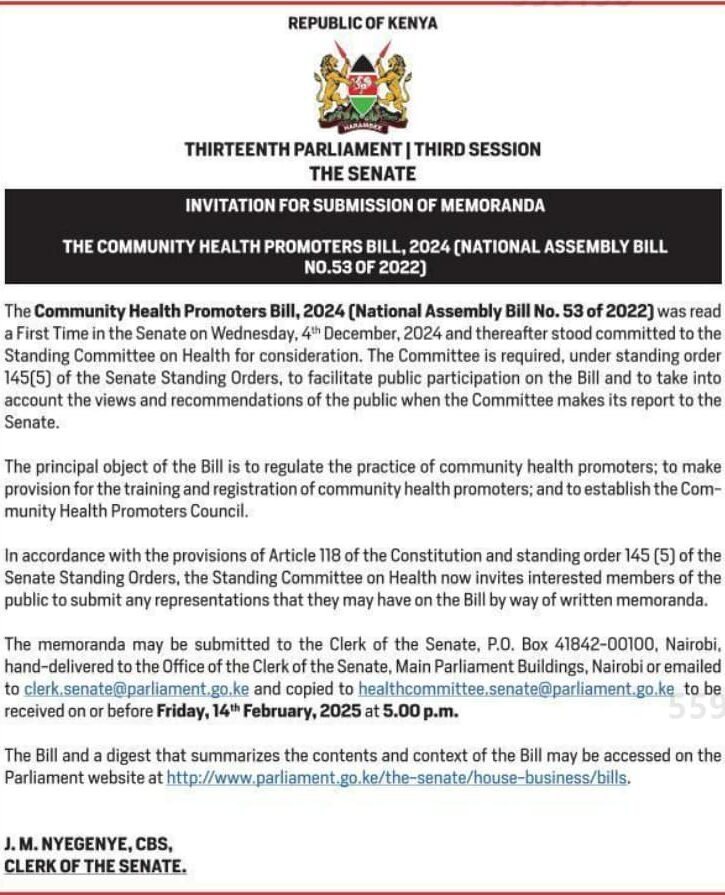 The Community Health Promoters Bill 2024 was first read in the Kenyan Senate in December 2024.